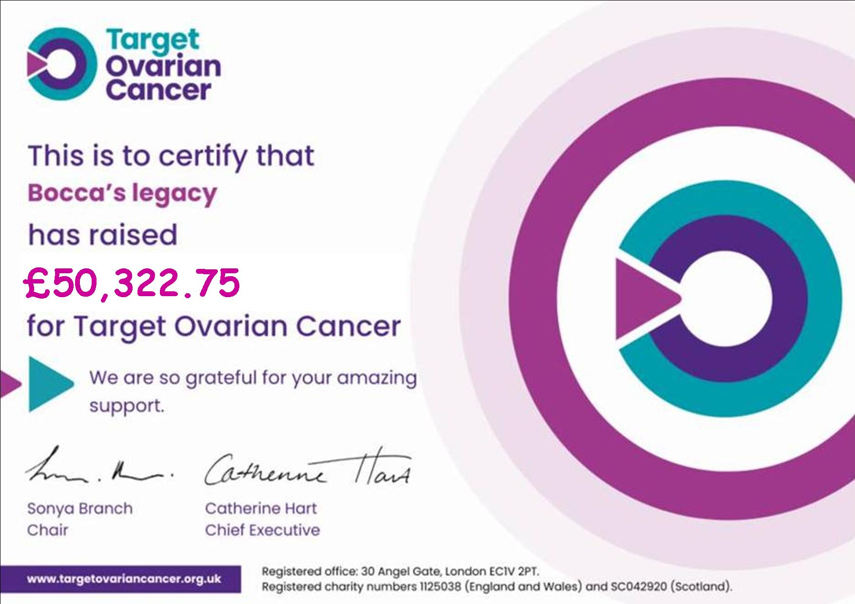 As a result of fund-raising and a very generous individual donation, we have now been informed by Target Ovarian Cancer that Bocca's Legacy fund now stands at ........